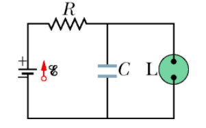 The fluorescent lamp L of negligible capacitance is connected in parallel across the capacitor C of an RC circuit. Then the capacitor discharges. The fluorescent lamp L of negligible capacitance is connected in parallel across the capacitor C of an R C circuit.